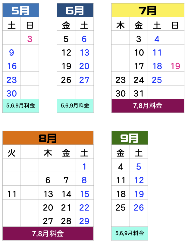 | 5,6,9月料金 | 7,8月料金 | |