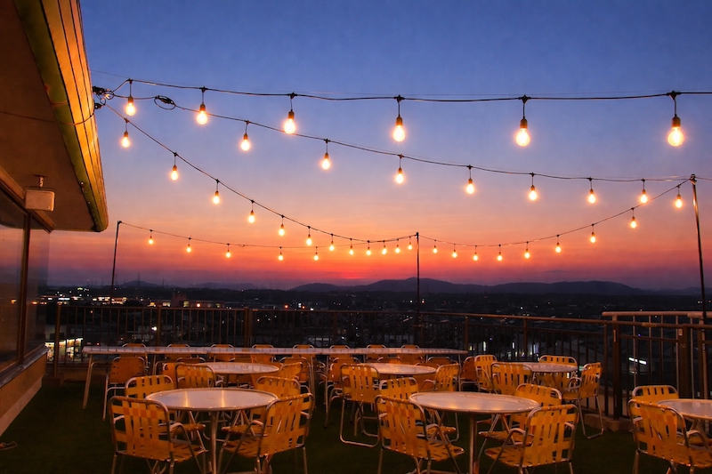ホテルの6階に相当する高いところを吹き抜ける夏の夜風は、他ではあまり味わえない体験です。回りに高い建物がないため、眼下に広がるハマキタの夜景をお愉しみ頂くことも可能です。