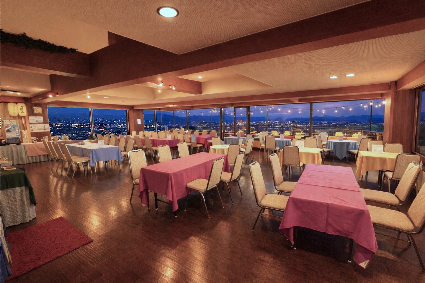 空調が入った室内は風や虫の心配もなく、料理台にも近いことから、ごゆっくりとお料理やお飲み物をお愉しみいただけます。もちろん、眼下に広がるハマキタの眺めもバッチリ